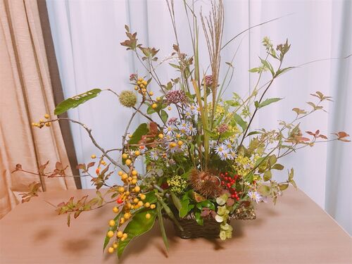 野花のアレンジメントは初めて。 洋花のアレンジメントとは違って、枝や虫喰い葉、色付いた葉を使ってカチッとしないような大胆さと、繊細な野花で形を作っていくのは、楽しいけど難しかった。 洋花だとオアシスを隠すようグリーンを刺してマスフラワーを刺…
